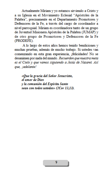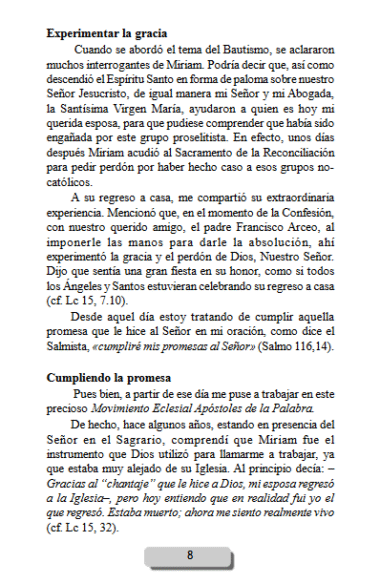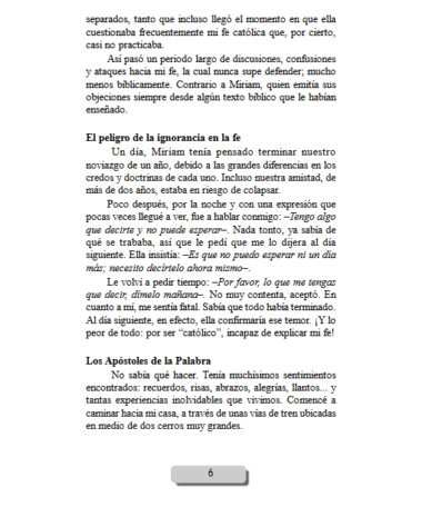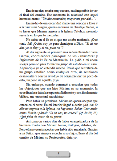 Tiempo después, ella comenzó a recibir estudio bíblico de parte de este grupo cristiano no- católico. Fue entonces que las cosas comenzaron a ponerse difíciles. Miriam ya no quería celebrar la Navidad ni su cumpleaños; estaba asimilando las enseñanzas de todos estos hermanos separados, tanto que incluso llego el momento en que ella cuestionaba frecuentemente mi fe católica que, por cierto, casi no practicaba.