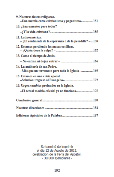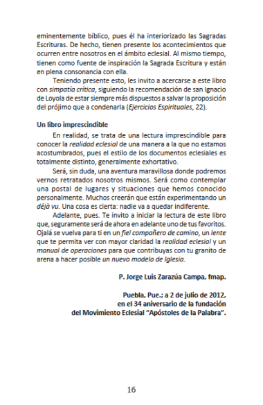 Adelante, pues. Te invito a iniciar la lectura de este libro que, seguramente será de ahora en adelante uno de tus favoritos. Ojalá se vuelva para ti en un fiel compañero de camino, un lente que te permita ver con mayor claridad la realidad eclesial y un manual de operaciones para que contribuyas con tu granito de arena a hacer posible un nuevo modelo de Iglesia.